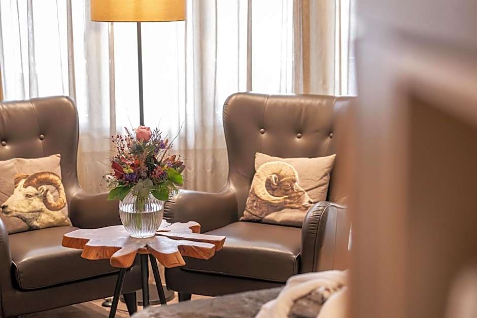 Spacious room in a traditional Grisons style, featuring a living area with an armchair, a flat-screen TV, and a Nespresso coffee maker. The south-facing balcony offers panoramic views over the Surselva Mountains.